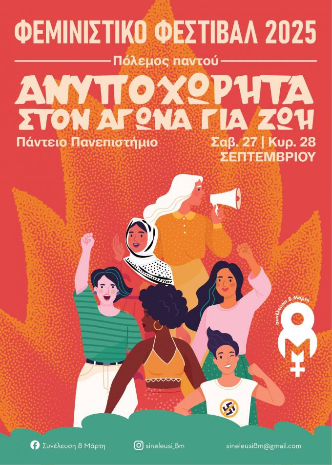 Το φεµινιστικό φεστιβάλ οργανώνεται για 4η συνεχή χρονιά στην Αθήνα, στις 27 και 28 Σεπτεµβρίου στο Πάντειο Πανεπιστήµιο µε κεντρικό σύνθηµα Πόλεµος παντού – Ανυποχώρητα στον αγώνα για ζωή. Φέτος περισσότερο από ποτέ νιώθουµε ότι απέναντι στον  πόλεµο που µαίνεται παντού, οι φεµινισµοί µας χρειάζεται να υπερασπιστούν ανυποχώρητα την ευάλωτη ζωή.