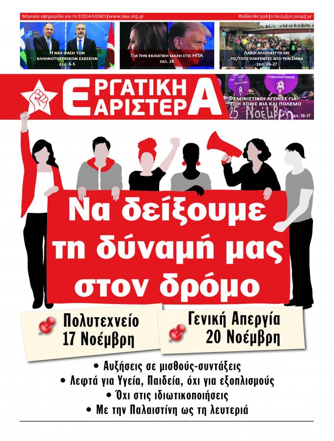 Πρώτα στην επέτειο του Πολυτεχνείου, που θα παρέμβουν στο δρόμο οι δυνάμεις της Αριστεράς, οι δυνάμεις της αλληλεγγύης στην Παλαιστίνη, οι δυνάμεις που υπερασπίζονται τα δημοκρατικά δικαιώματα ενάντια στον αυταρχισμό, που προβάλουν την πάλη για αλλαγή της κοινωνίας ενάντια στο ζόφο και τη μισαλλοδοξία που προβάλει η ακροδεξιά ως απάντηση.