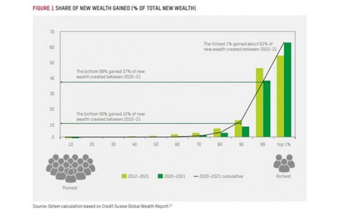 Κατά τη διάρκεια των ετών της πανδημίας και της κρίσης του κόστους ζωής από το 2020 και μετά, 26 τρισεκατομμύρια δολάρια (63%) του συνολικού νέου πλούτου κατέλαβε το πλουσιότερο 1%, ενώ 16 τρισεκατομμύρια δολάρια (37%) πήγαν σε όλο τον υπόλοιπο κόσμο. Ένας δισεκατομμυριούχος κέρδισε περίπου 1,7 εκατ. δολάρια για κάθε 1 δολάριο νέου παγκόσμιου πλούτου που κέρδισε ένα άτομο που ανήκει στο κατώτερο 90%.