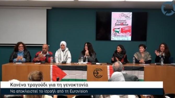 Με επιτυχία πραγματοποιήθηκε στις 15.12.25 στην ΕΣΗΕΑ η εκδήλωση που διοργάνωσαν το BDS Greece, το Πολιτιστικό Δίκτυο για την Παλαιστίνη, η Παλαιστινιακή Παροικία Ελλάδας και οι Journalists for Palestine GR, με σύνθημα: «Κανένα τραγούδι για γενοκτονία!» – Αποκλεισμός του Ισραήλ από τη Eurovision. Κάντε το όπως η Ισπανία, η Ιρλανδία, η Ολλανδία, η Σλοβενία, η Ισλανδία.
